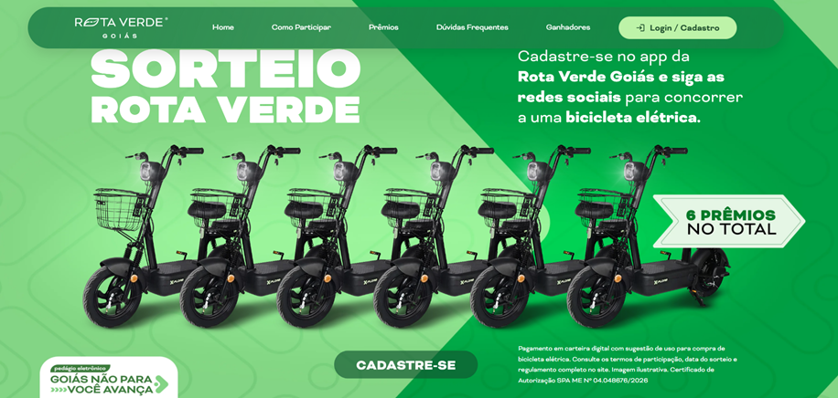 A Rota Verde Goiás lança uma campanha especial para incentivar a conexão com os usuários da BR-060 e da BR-452 e ampliar o acesso aos seus canais digitais: serão sorteadas seis bicicletas elétricas para quem baixar o aplicativo oficial da Concessionária, que é um canal para quem não tem TAG no veículo consultar as passagens pelos pórticos e pagar o pedágio. Para participar do sorteio também é necessário curtir as redes sociais da Rota Verde e se cadastrar no site da campanha, o sorteiorotaverdegoias.polgo.com.br